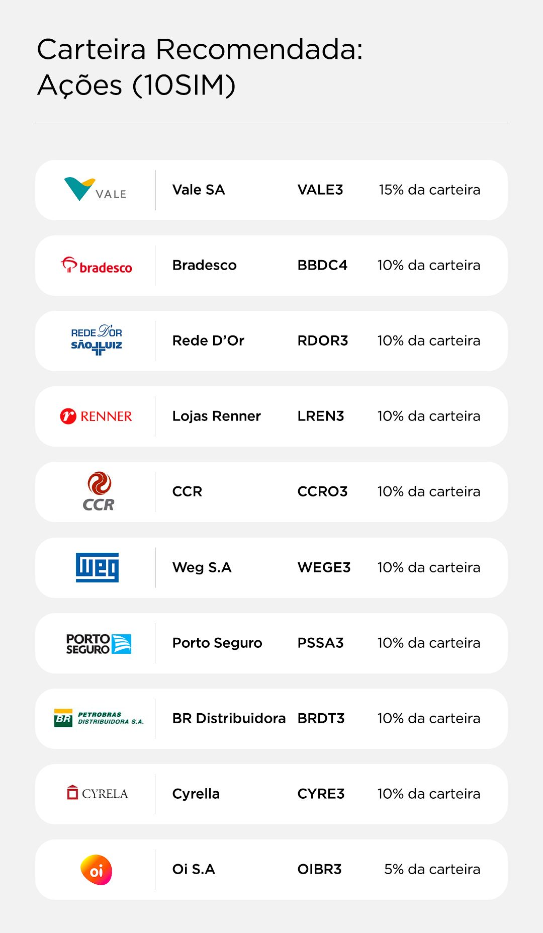 O objetivo da carteira recomendada, divulgada pela equipe do BTG Pactual, o melhor researchda América Latina, é apresentar as 10 melhores oportunidades de performances do mercado de ações do Brasil, sem considerar necessariamente índices de referência ou liquidez.