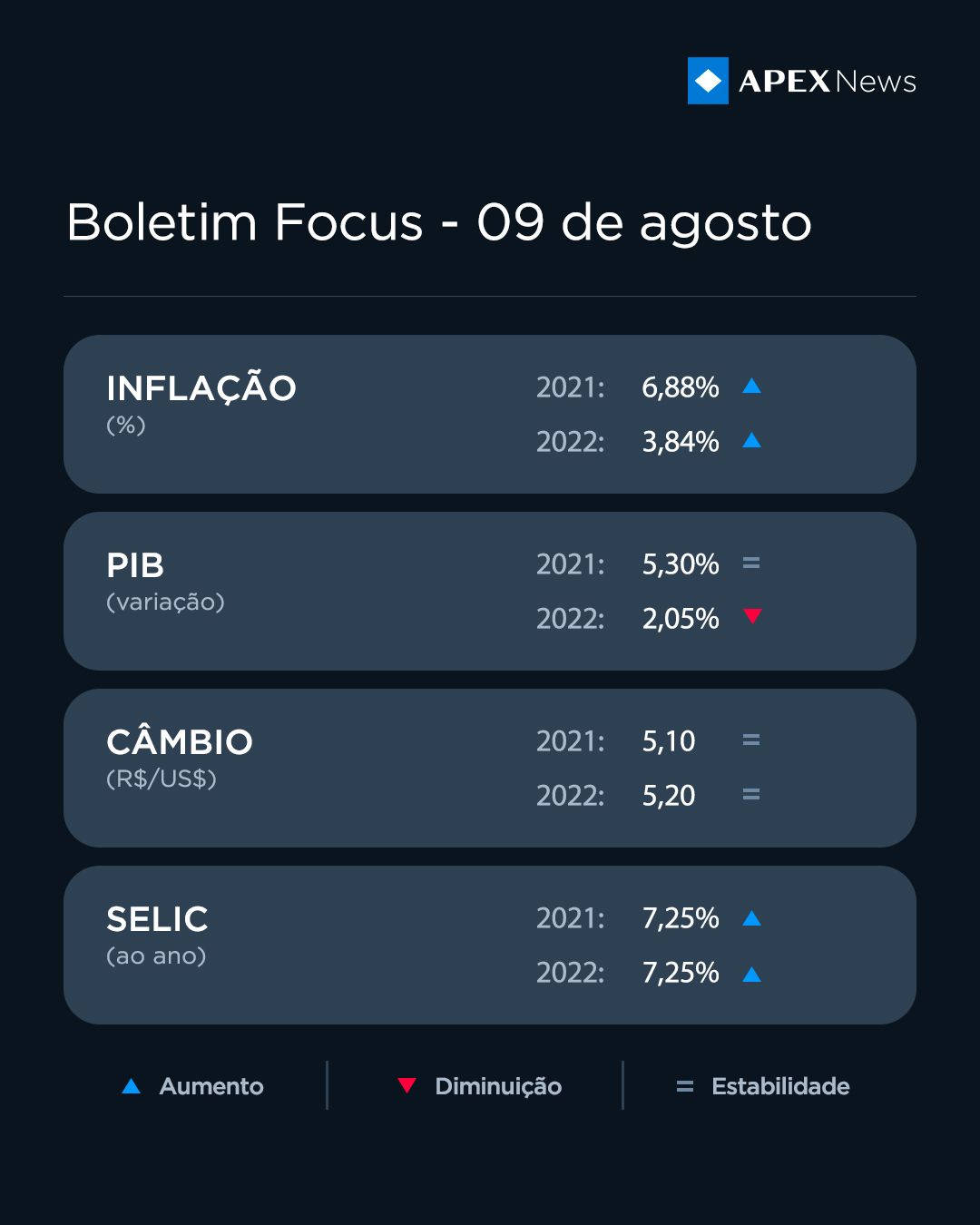 Para o nível de atividade, mensurado pelo Produto Interno Bruto, o PIB, a estimativa seguiu estável em crescimento de 5,30% ao longo de 2021. Já para 2022, a estimativa apresentou queda, saindo de 2,10% de crescimento para 2,05%.