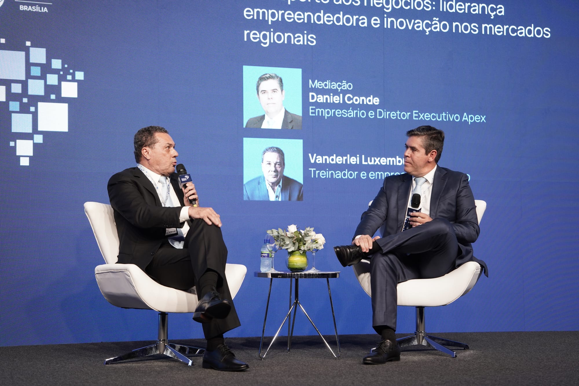 O painel “Do esporte aos negócios” contou com Vanderlei Luxemburgo, um dos maiores técnicos do futebol brasileiro, que também possui uma longa trajetória empreendedora. Mediado por Daniel Conde, empresário e diretor executivo da Apex, o debate abordou as competências essenciais para a liderança de alta performance no esporte e no mundo corporativo.