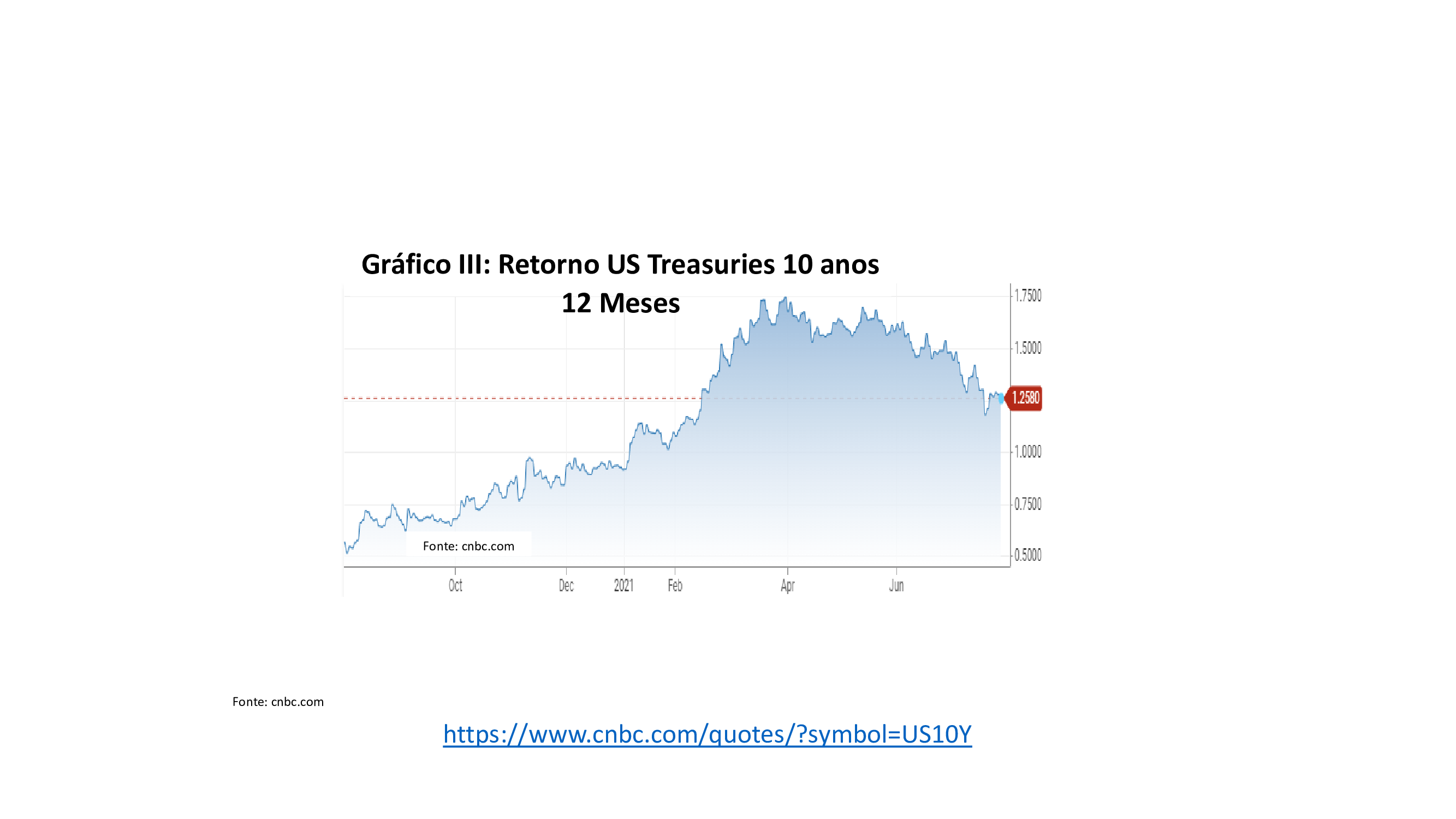 Como podemos ver no Gráfico III, o aumento dos retornos dos títulos do governo dos EUA começa em agosto de 2020 com a redução do risco da pandemia, a recuperação da economia e a vacinação. No início de 2021, o aumento da inflação trouxe novo aumento dos retornos.