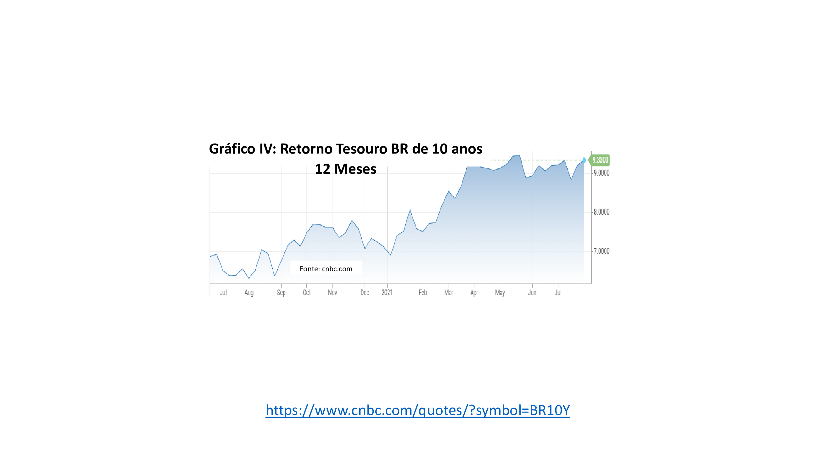 O item (i) já foi bastante discutido. Quanto aos itens (ii) e (iii), as reformas continuam gerando incertezas. Por exemplo, a Reforma Tributária em análise no Congresso pretende elevar a carga de impostos pagos pelo setor privado. Além disso, a aproximação das eleições deve gerar aumento das pressões para elevar os gastos, podendo elevar o risco fiscal. Quanto o item (iv), a discussão e a implantação do tapering tende a aumentar os retornos dos treasuries, puxando o retorno no Brasil.