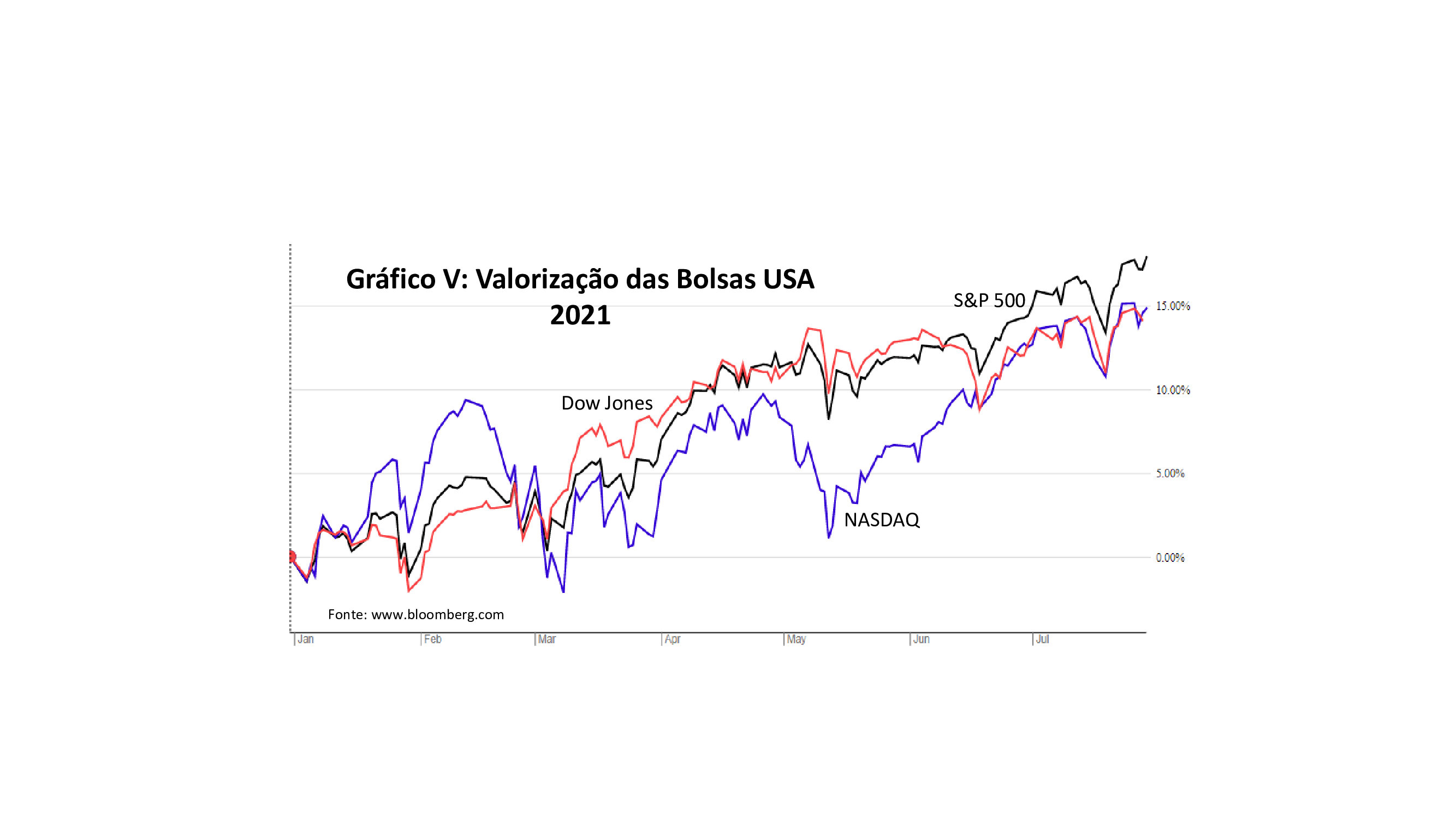 Desde a estabilização dos retornos dos treasuries em fins de março, os principais índices das bolsas americanas recuperaram a tendência de alta (gráfico V) e voltaram a bater novos recordes de pontuação.