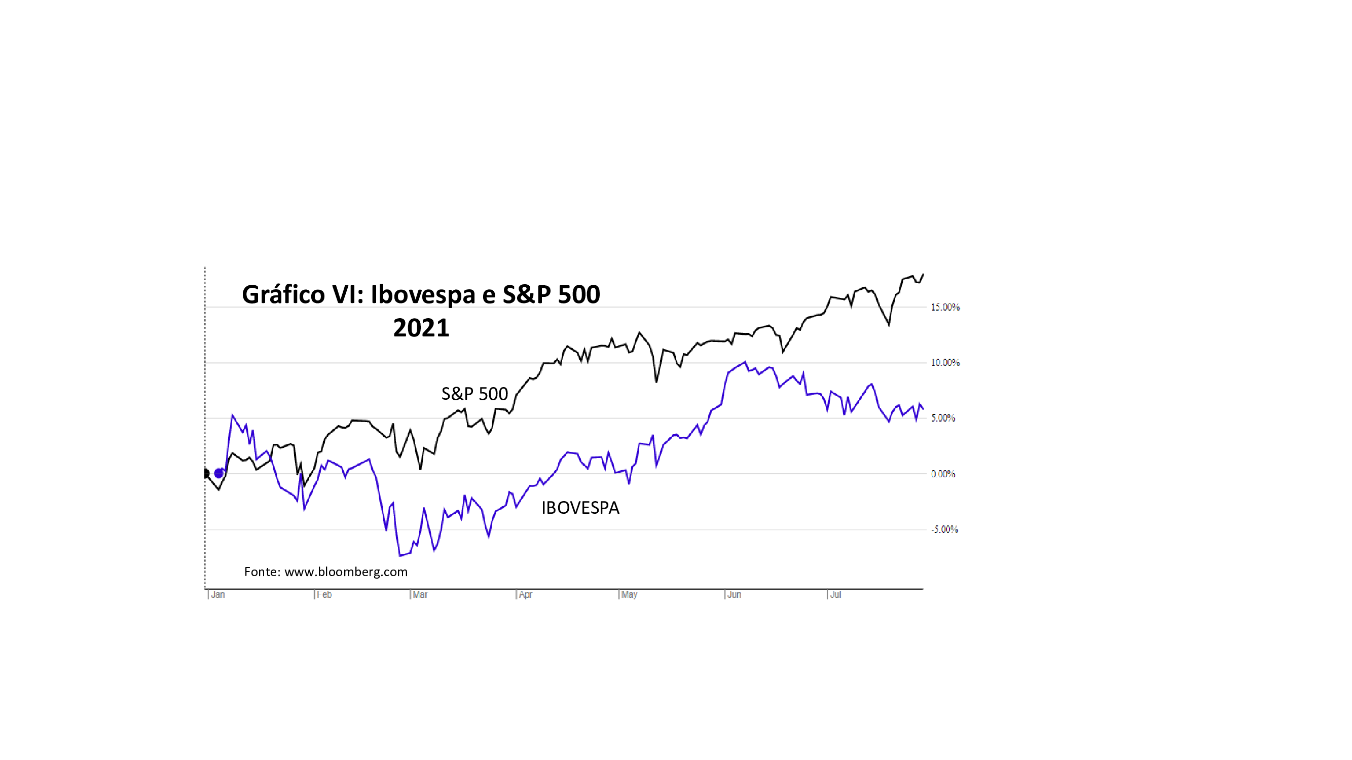 A recuperação da economia, a estabilidade política no segundo trimestre de 2021 e o avanço na vacinação permitiram que o Ibovespa retomasse a valorização e voltasse a bater novos recordes (gráfico VI). Mas esta tendência desaparece em meados de junho, quando o mercado doméstico descolou do mercado americano.
