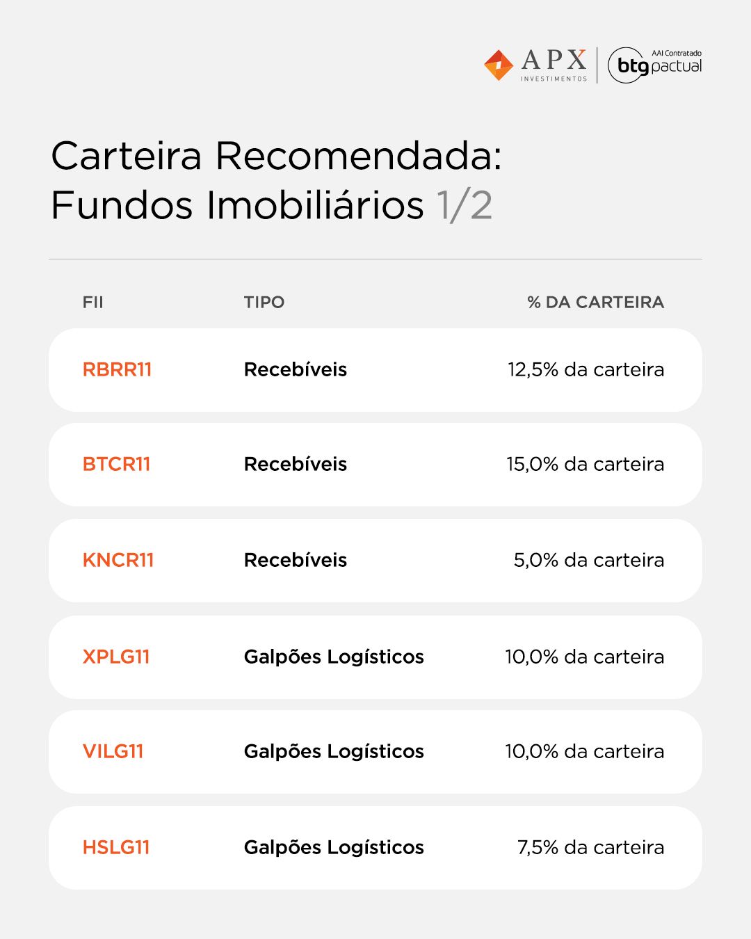 A Apex News divulga mensalmente um resumo das teses e dos fundamentos por trás da carteira recomendada de fundos imobiliários (FIIs) do BTG Pactual. A carteira de fundos imobiliários apresentou um desempenho negativo de 1,43% em maio, melhor do que o Índice de Fundos Imobiliários (IFIX), que caiu 1,56% no período, encerrando o mês no patamar dos 2.816 mil pontos.