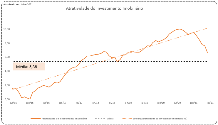 Mesmo com aumento de juros, atratividade do investimento imobiliário ainda segue acima da média. Ao observarmos a valorização dos imóveis e a taxa de juros de mercado, a atratividade geral do investimento imobiliário, apesar de uma redução em julho, segue acima da média da última década. O resultado segue endossado, como destacamos no último mês, pela valorização no preço de aluguéis tanto de imóveis comerciais quanto residenciais.