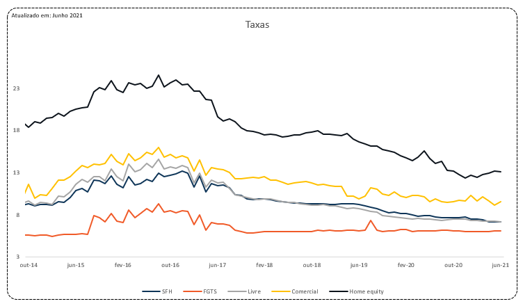 Com Selic em alta, players do mercado seguem na trajetória de elevação das taxas de financiamento imobiliário. A partir das pressões inflacionária e da resposta do Banco Central com a elevação dos juros, as taxas de financiamento do setor imobiliário seguem a mesma trajetória. Nesse sentido, os principais bancos seguem na tendência de reajustes. Contudo, vale lembrar que, como na última atualização, as taxas ligadas aos segmentos comerciais e de home equity ainda seguem em patamares historicamente reduzidos.
