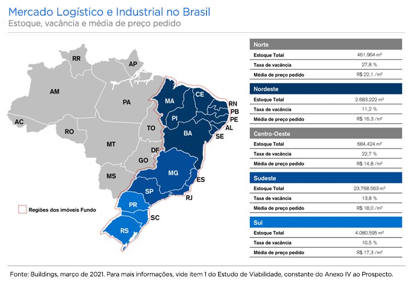 Quanto à composição do fundo, ele possui uma carteira pulverizada, com 17 imóveis em cinco estados: MG, PE, RJ, SC e SP. Estes são mais concentrados em São Paulo (SP), como pode ser visto no quadro abaixo, que mostra que a maior parte dos ativos do fundo estão na região Sudeste. A vacância total do fundo está em 7%, valor considerado baixo no segmento em que ele atua.