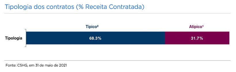 Além disso, em relação à tipologia dos contratos, 68,3% estão alocados em contratos típicos, o que significa que são contratos de locação padrão. Já os contratos de locação atípicos são aqueles provenientes de operações Built to Suit (construção sob medida), Sale and Leaseback (compra e locação concomitante) e outras operações estruturadas com condições diferenciadas, tais como prazo, multas e aviso prévio para desocupação. Nesta modalidade, o percentual dos contratos é de 31,7%.