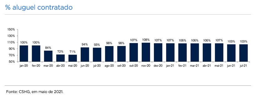Para exemplificar a curva dos acordos já firmados, o gráfico abaixo mostra a evolução da porcentagem de aluguel contratado já considerando os impactos dos diferimentos acordados pelo fundo individualmente com cada um de seus locatários, considerando a realidade imposta pela pandemia.