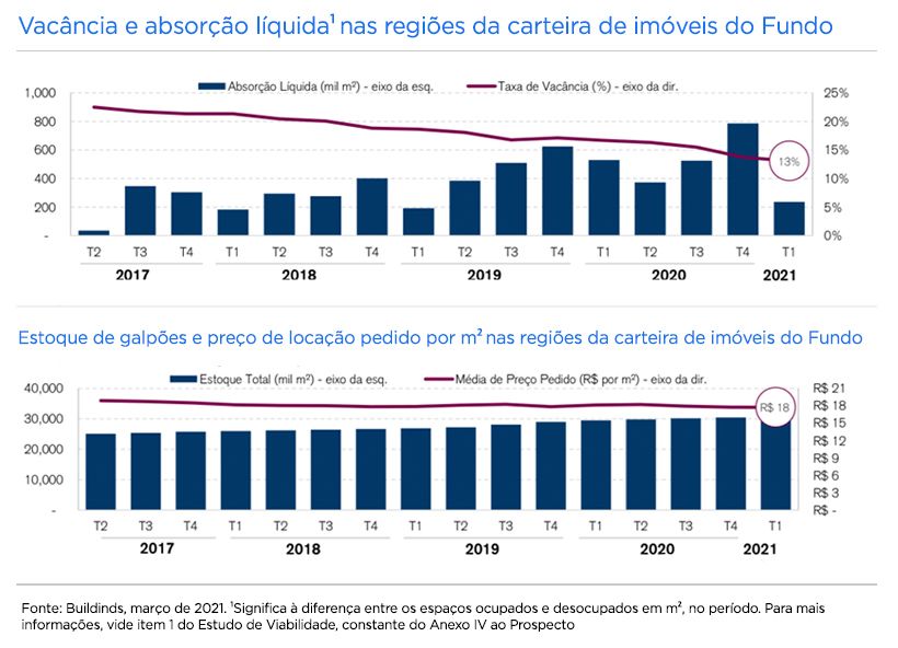 A vacância do HGLG11 vem caindo continuamente. Após iniciar 2017 em 22%, chegou a 13% no final do primeiro trimestre de 2021, ante 7,60% em fevereiro de 2021. Já o estoque de galpões e o preço de locação por m² nas regiões em que ele atua permaneceram praticamente estáveis nos últimos anos.