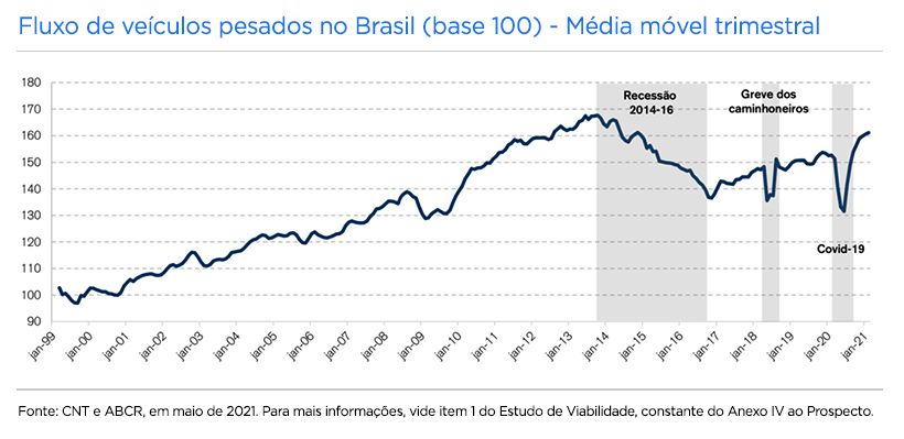 Além disso, com a pandemia houve uma demanda maior pelo e-commerce, por exemplo, de forma a impulsionar também a demanda por galpões para armazenagem. Nesse sentido, o fluxo de veículos pesados no país é um indicativo deste mercado, visto que a circulação de carga por estradas é um vetor importante de monitoramento da atividade logística do país.