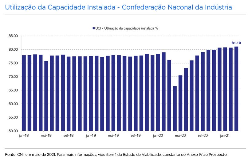 Por fim, o mercado logístico vai melhor quanto maiores forem os patamares da atividade econômica no país. Nesse sentido, a utilização da capacidade é um indicador relevante, e este já está acima do nível anterior à pandemia.