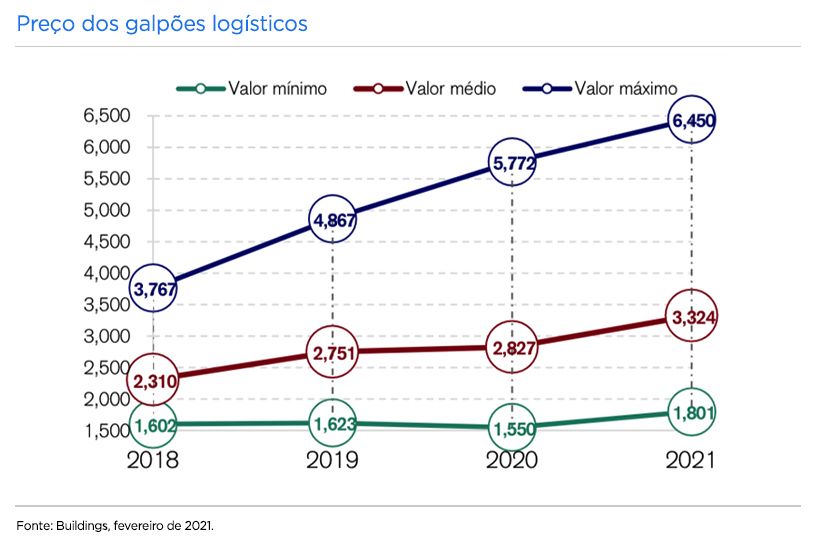 Durante os últimos anos, os preços médios de aquisição de galpões logísticos prontos aumentarem em 44%, impulsionados principalmente por três fatores: a queda da taxa de juros, que acabou por reduzir a expectativa de retorno sobre a renda de galpões logísticos prontos; o surgimento de novos entrantes no mercado de fundos imobiliário logísticos, que aumentaram a competição por galpões prontos; e a melhora e resiliência que o setor logístico demonstrou nos últimos quatro anos.