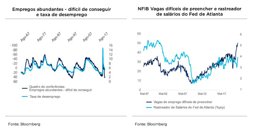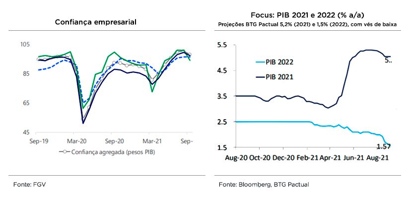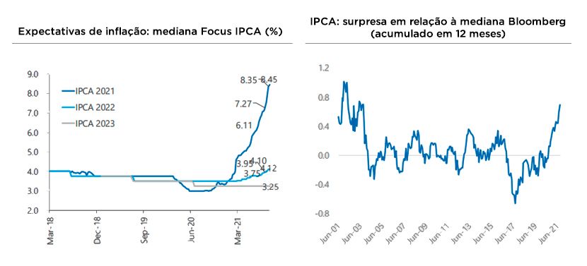 Em relação aos preços de bens industriais, os estoques muito baixos e as rupturas de cadeias globais implicam em pressões persistentes, com IPA-industrial apontando para risco altista. Já nos preços de serviços, a reabertura e o aumento de custos, a exemplo de energia, aluguéis e alimentos, mantém pressões no curto prazo.