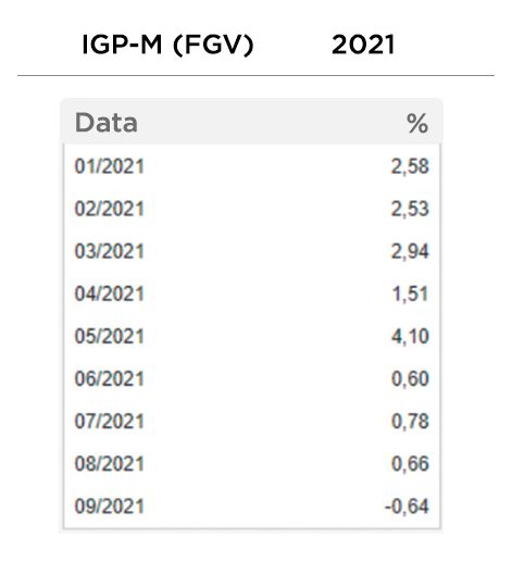 Ainda, em termos de indicadores, o IGP-M já começa a mostrar desaceleração no ritmo de crescimento, após as máximas alcançadas durante a pandemia, chegando a registrar queda de 0,64% em setembro deste ano.