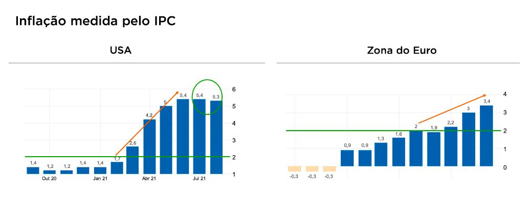 Já a inflação vem se elevando em grande parte dos países do globo no mesmo período. O IPC (Índice de Preços ao Consumidor) na zona do euro está em escalada, enquanto nos EUA ela seguiu uma trajetória ascendente até junho deste ano, e manteve-se no mesmo patamar desde então.