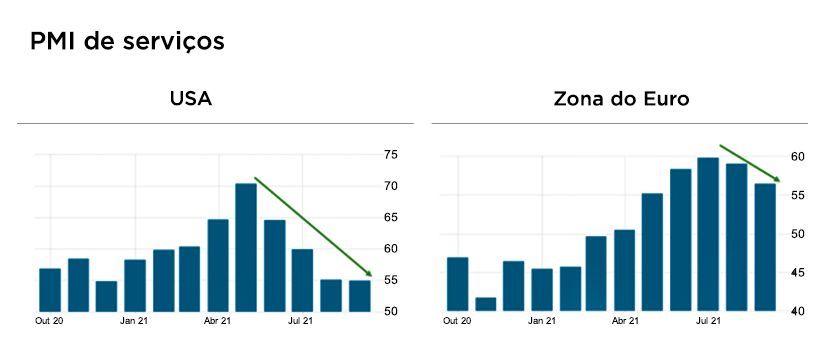 As maiores economias do mundo mostraram desaceleração no crescimento e aumento da inflação a partir do segundo semestre de 2021. A exemplo de China, EUA e zona do euro, que viram quedas expressivas nos Índices de Gerentes de Compras, do inglês, Purchasing Manager's Index (PMI), indicador que mede a intensidade da atividade econômica a partir de pesquisas mensais com gerentes das empresas do setor avaliado. O setor de serviços foi destaque para as quedas do indicador, conforme é possível visualizar abaixo no caso europeu e americano.