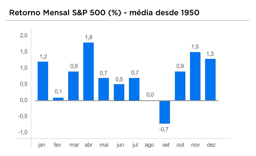 Apesar das quedas recentes, vale lembrar que, na média, a bolsa está bastante descontada, com nível de P/L abaixo dos patamares da pandemia, em torno de 7,9x. E, à título de curiosidade, os últimos meses do ano são historicamente conhecidos pelos retornos acima da média do restante do ano, conforme podemos ver no gráfico abaixo, que mostra o retorno histórico mês a mês do S&P 500.